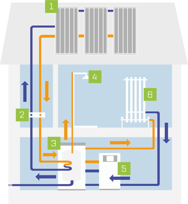Solarkollektoren [1] bestehen aus einer mit Glas bedeckten, dunkel beschichteten Metallfläche. Diese nimmt die Sonnenstrahlen auf und gibt die Wärme an ein System aus Kupferröhren auf der Rückseite der Kollektoren ab. Eine Flüssigkeit aus Wasser und Frostschutzmittel transportiert im Röhrensystem die Wärme mithilfe einer Pumpe [2] in einen Speicher [3].
